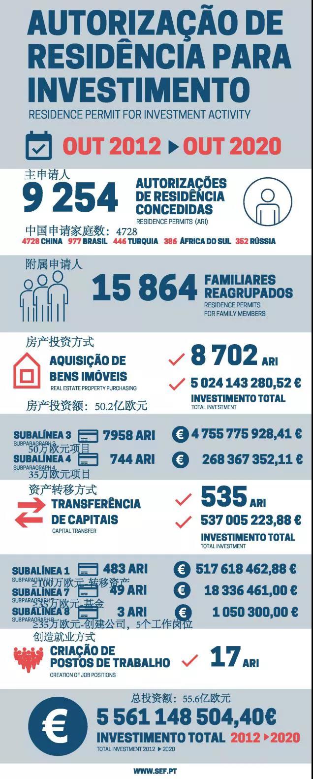 葡萄牙黄金签证计划实施至今已经8年时间,8年间共有9254名主申请人成功获得黄金居留卡,随行家属高达15864人,共计吸引投资高达56亿欧元。