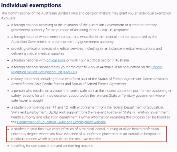 为此,联邦政府在新的财政预算案中公布了留学入境计划,澳洲移民局官方网站新增了一条海外学生的入境豁免条例,在医学、牙科、护理或相关健康专业的大学课程的最后两年学习中的学生,如果有证据表明已确认在接下来的两个月内,将开始在澳洲医院或医疗机构工作,则可以申请入境豁免。