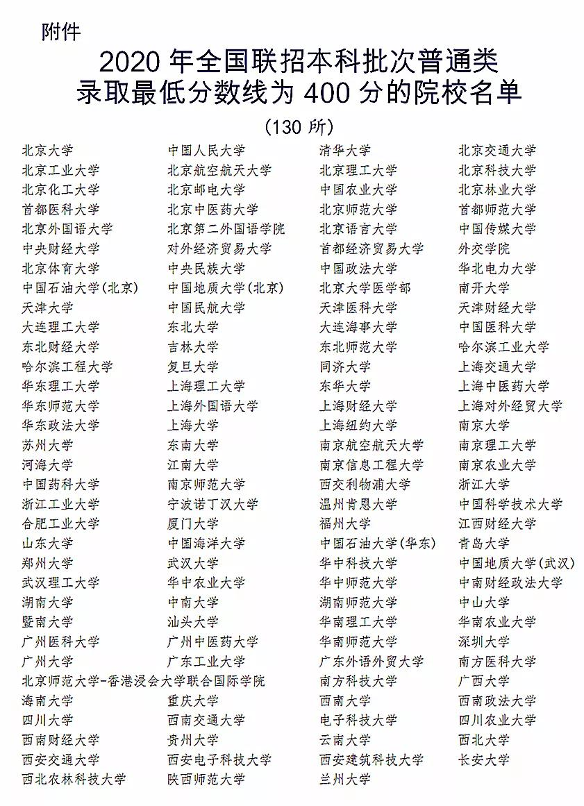 2020年全国联招本科批次普通类录取分数线为400分的院校名单中显示,华侨生联考最低分数400分的本科院校有130所,其中还囊括了北京大学、清华大学、中国人民大学等多家中国211、985名牌大学,和国内普通高考名牌大学录取分数650分相比,录取分数相当低