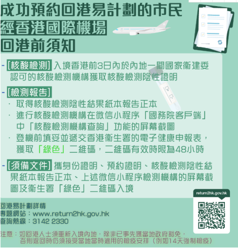 根据香港政府公布的“回港易计划”规定,所有回港人员都要在网上预约系统进行申报(网址:https://www.quotabooking.gov.hk/cbt_booking/index_hk_sc.jsp),并且提交入境3日前于粤港、港澳两地政府互认的医疗机构获取核酸检测阴性证明,获取通关二维码。
